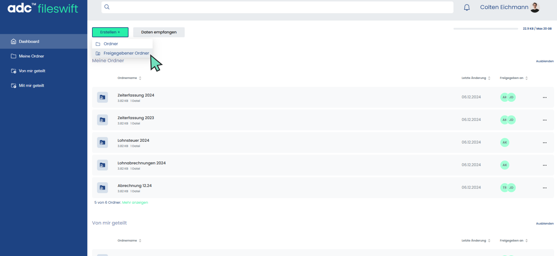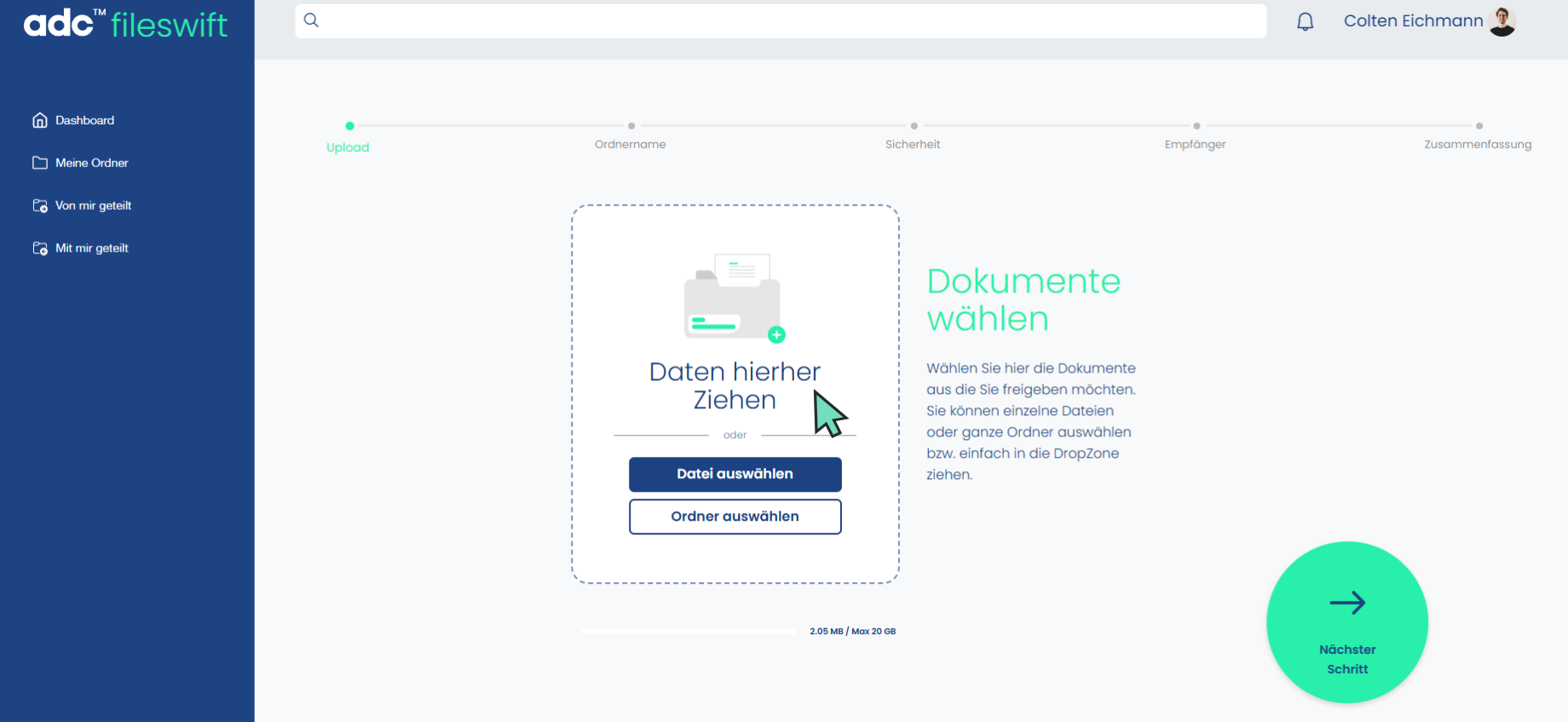 Wählen Sie hier die Dokumente aus die Sie freigeben möchten. Sie können einzelne Dateien oder ganze Ordner auswählen bzw. einfach in die DropZone ziehen.