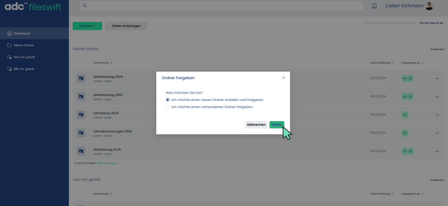 Bitte klicken Sie auf „Ich möchte einen neuen Ordner erstellen und freigeben“, dann auf „Weiter“.
